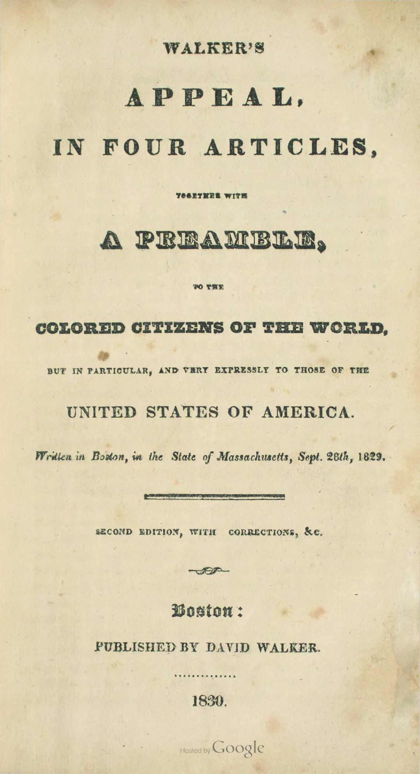 David Walker, Walker’s Appeal, in Four Articles; Together with a Preamble, to the Coloured Citizens of the World, but in Particular, and Very Expressly, to Those of the United States of America (Boston: Revised and Published by David Walker, 1830), in University of North Carolina, “Documenting the American South,” docsouth.unc.edu/nc/walker/walker.html.